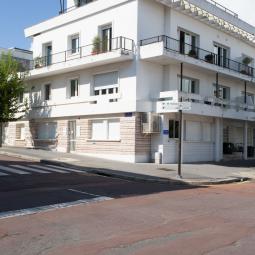 Situé dans le quartier de FONCILLON, au centre de Royan, ce massif immeuble d'angle et tout l'îlot qui se déploie jusqu'à Notre Dame de Royan ont pour architecte Roger Mialet (collaborateurs Bauhain, Baraton, Hébrard).